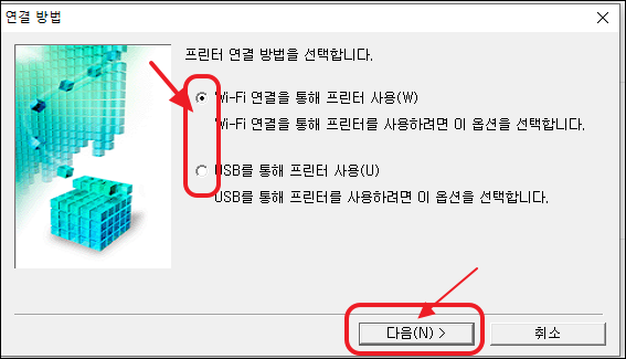연결한 프린터가 wi-fi 인지 usb로 설치했는지 클릭을 하고 다음버튼을 눌러줍니다.