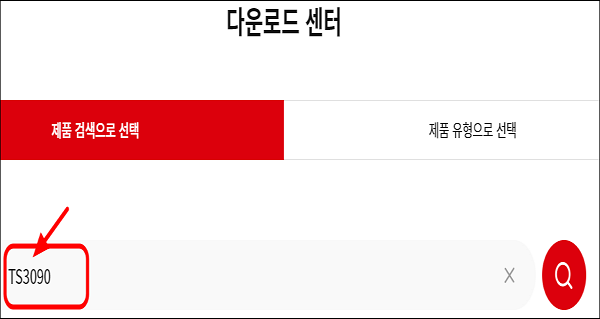 다운로드센터를 클릭하면 검색창이 나옵니다. 제품 검색으로 선택에서 MG3090 또는 TS3090을 작성하여 검색을 합니다.