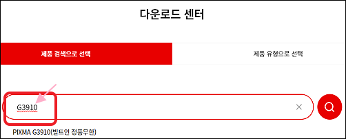첫화면인 다운로드 센터에서 제품 검색으로 선택에 G3910을 검색하여 PIXMA G3910(빌트인 정품무한)을 클릭한다.