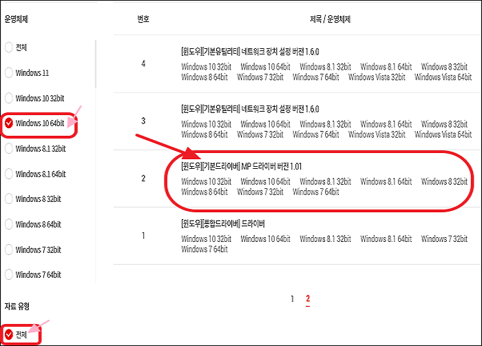 검색 후 운영체제에 Windows10 64bit를 클릭하고 아래 자료유형에 전체를 클릭한다. 우측 제목/운영체제에서 [윈도우][기본드라이버] MP드라이버 버전 1.01에 들어간다.