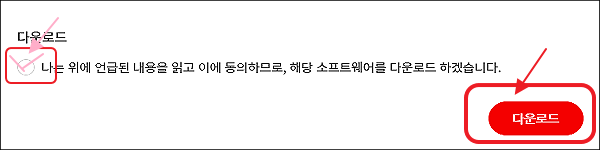 다운로드 나는 위에 언급된 내용을 읽고 이에 동의하므로, 해당 소프트웨어를 다운로드 하겠습니다 체크하고 다운로드를 눌러준다.