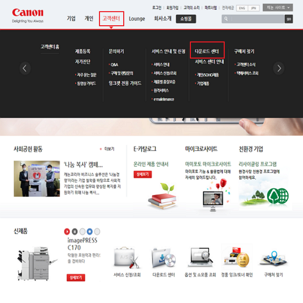 기본 설치는 캐논 홈페이지에 접속하셔야 합니다. 캐논 주소( www.canon-bs.co.kr/main/) 접속해서