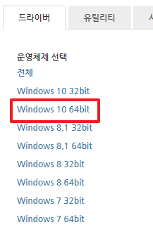 저희 집 컴퓨터는 Windows 10pro 64bit 라서 좌측 드라이버- Windows 10pro 64bit 클릭- 우측 두번째 프린터드라이버ver 다운로드 클릭