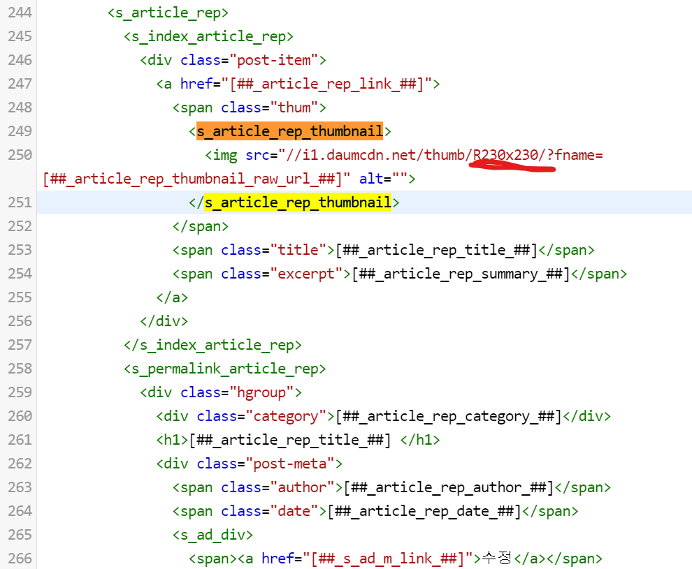자, 이제 마지막으로 적용을 눌러주고 첫번째인 HTML을 클릭한다. ctrl+F(찾기)를 눌러 s_article_rep_thumbnail 를 찾는다. 주황색으로 검색된 부분 아래 우측에 C264x200을 R230x230으로 변경하고 적용을 눌러준다. (R=대문자 x는 소문자)